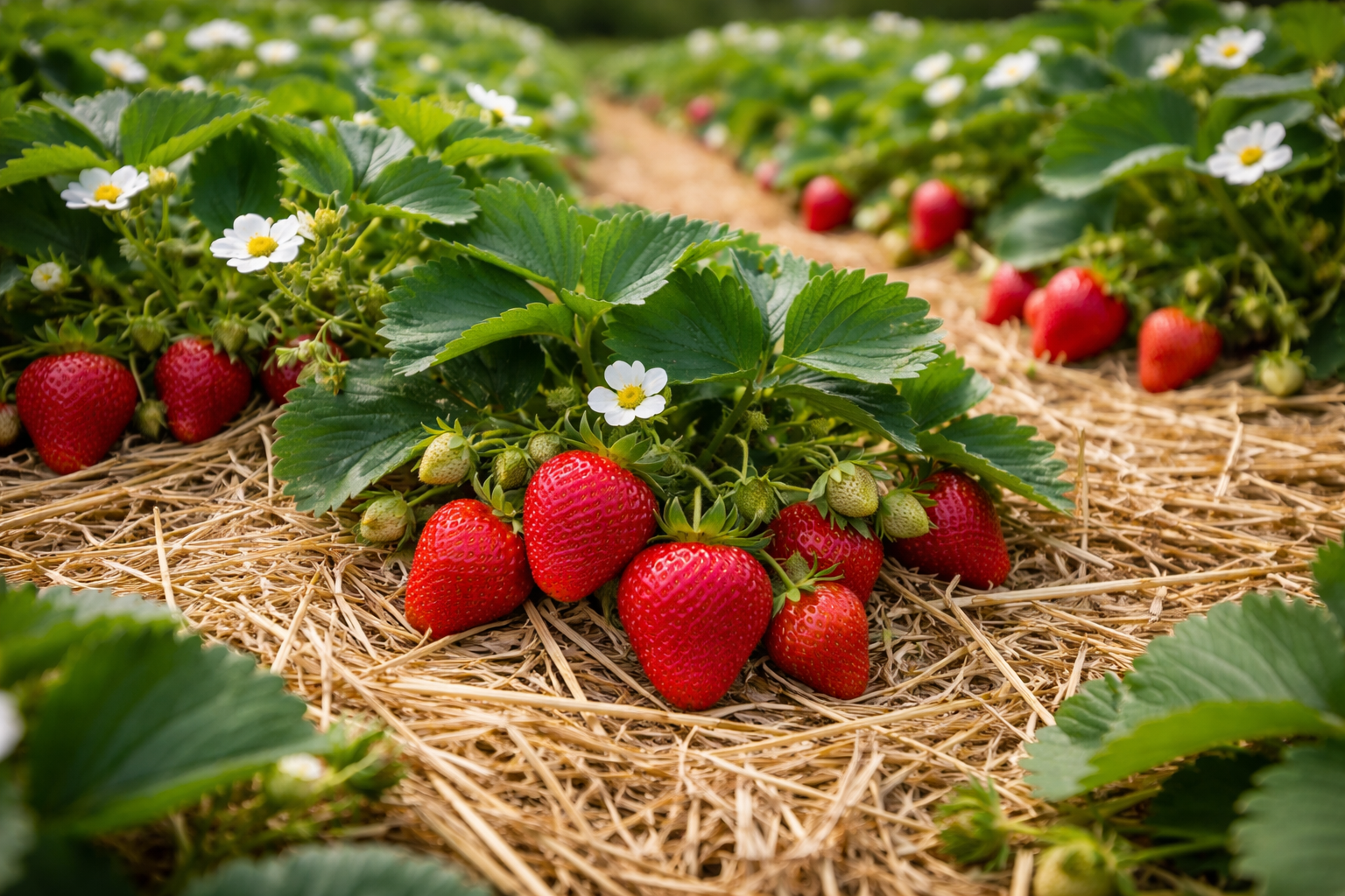 A védő mulcsréteg megtartja a nedvességet a talajban, és megakadályozza, hogy az érett gyümölcsök megrothadjanak, ha nedves talajjal érintkeznek.