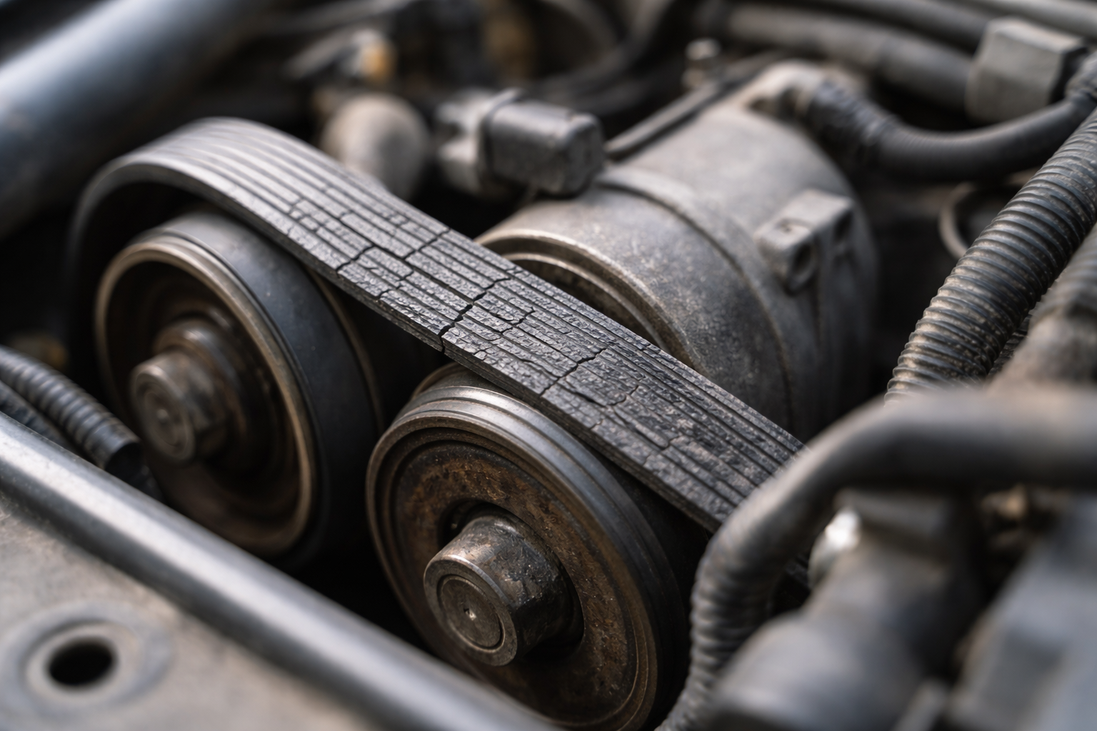 Nyissa ki a motorháztetőt, és vizuálisan vizsgálja meg meghajtószíjak mély repedések vagy delaminációk esetén.