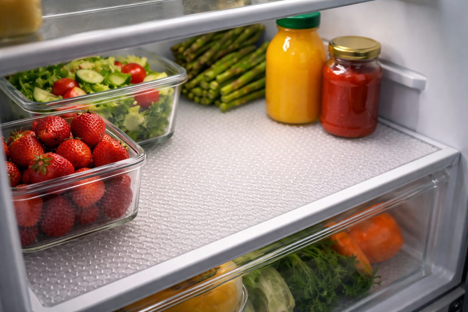„Titkos tipp: Ha szőnyeget választasz, mindig olyan szőnyeget válassz, amelyiknek méhsejtes a textúrája. Ez jobb légáramlást biztosít az ételek alatt, ami kritikus fontosságú a zöldségek és bogyós gyümölcsök alsó fiókokban történő tárolásakor” – személyes tanácsok egy szakértőtől.