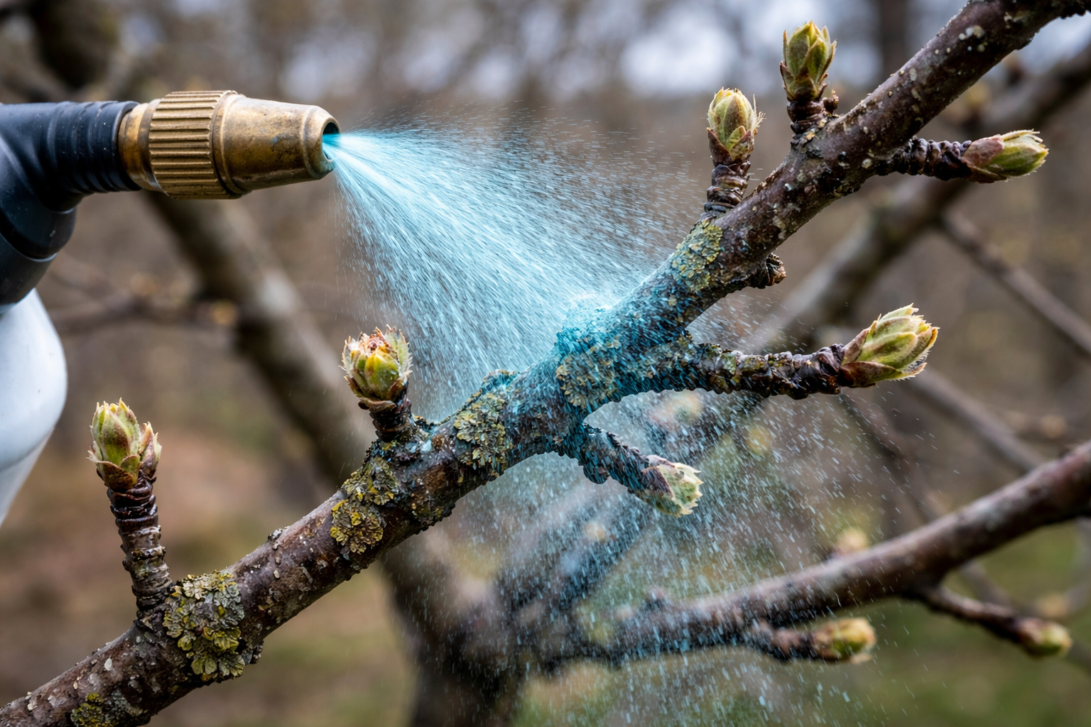 A törzs körüli permetezés kiváló módszer a tavalyi lombozatban telelő gombaspórák elpusztítására.