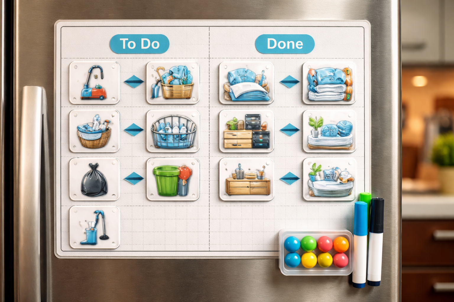 Titkos árnyalat: hozzon létre egy mágnesekkel ellátott vizuális táblát, ahol a család minden tagja önállóan jelölheti az elvégzett feladatokat, boldogan áthelyezve azokat a „tennivalók” oszlopból a „kész” oszlopba.
