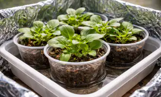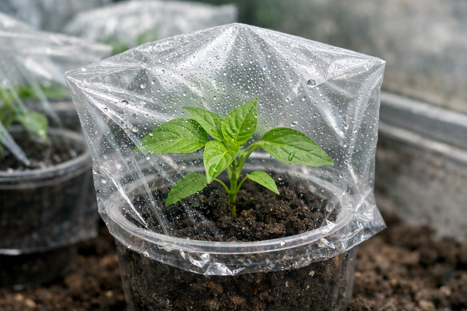 A gyors megtelepedés legfőbb titka, hogy minden gyenge bokor fölé egy átlátszó fóliából készült mini üvegházat építünk, ami azonnal csökkenti a nedvesség párolgását a levélfelületről.
