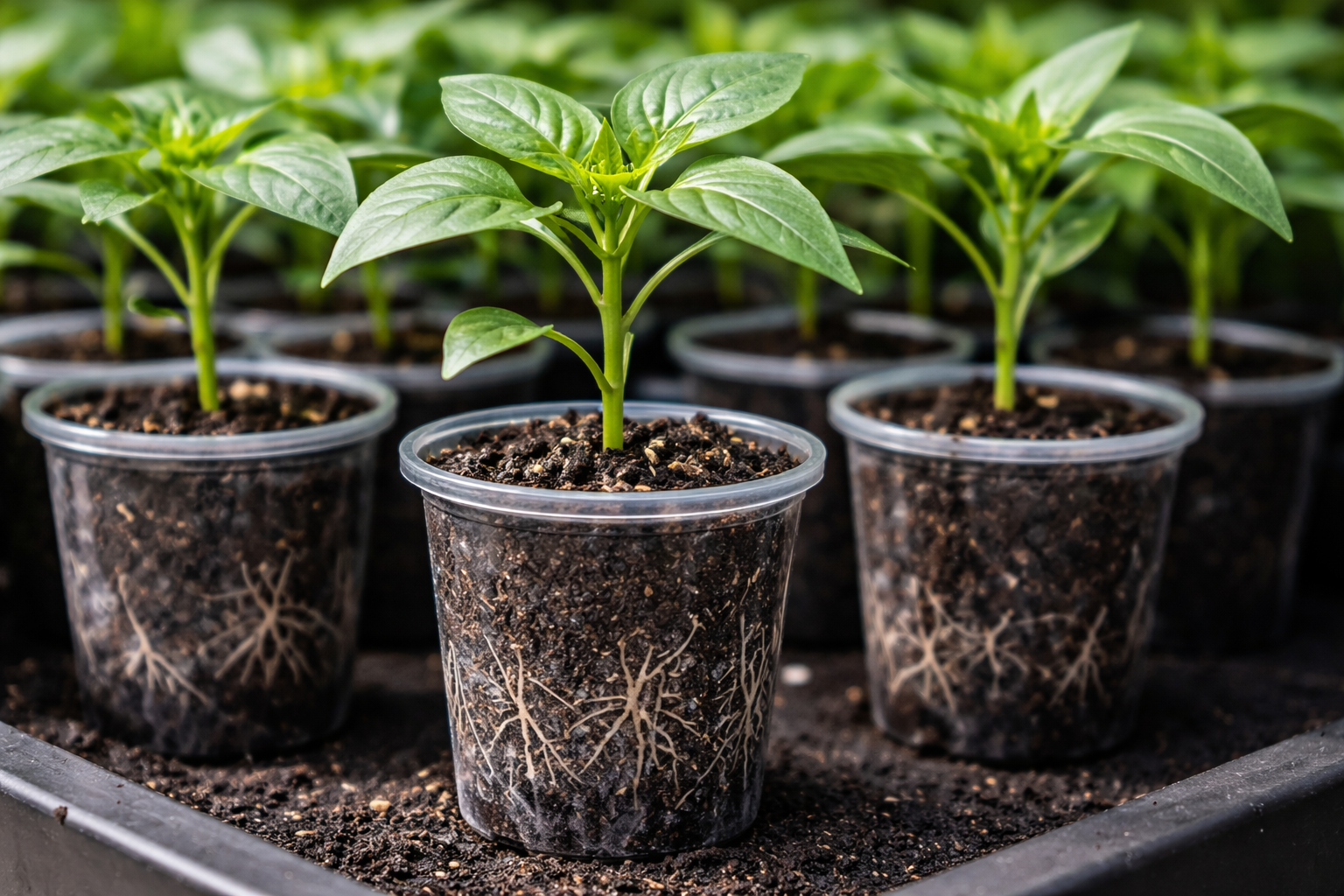 A sötét konténerek jobban képesek megtartani a paprikának szükséges hőt, míg az átlátszó falak lehetővé teszik a termesztő számára, hogy vizuálisan ellenőrizze a gyökérzet állapotát.
