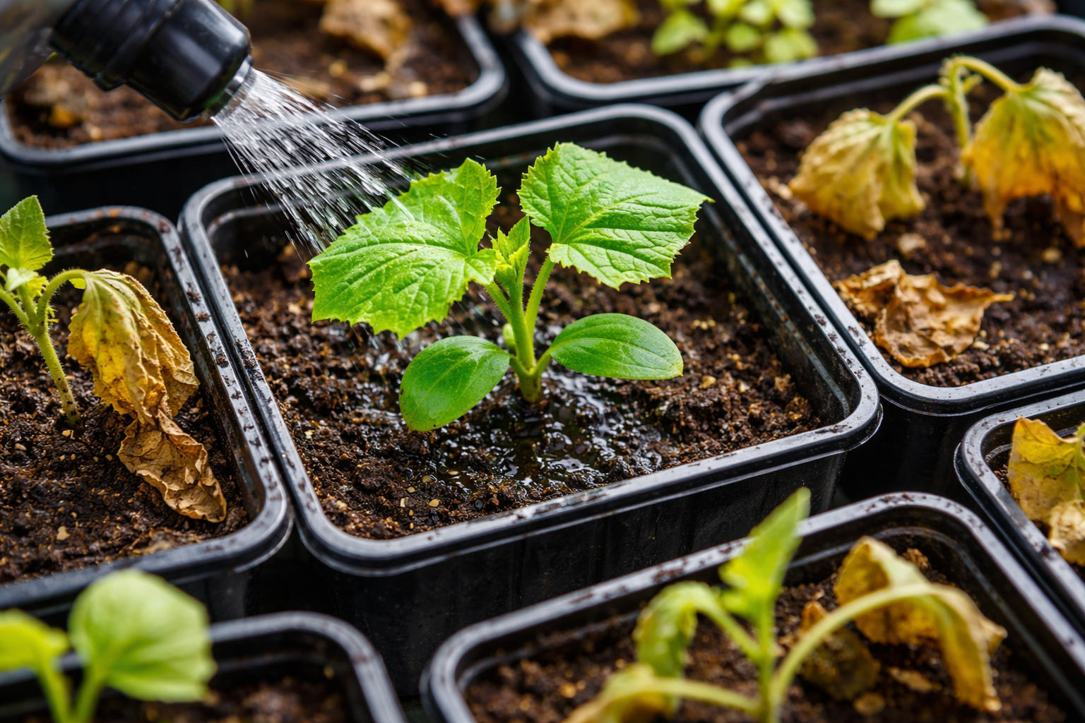 A megfelelő öntözés művészet, amely szigorú egyensúlyt igényel. Hőmérsékleti stressz ugyanolyan gyorsan elpusztítja a palántákat, mint a szárazság. A vizet mindig melegen kell tartani.