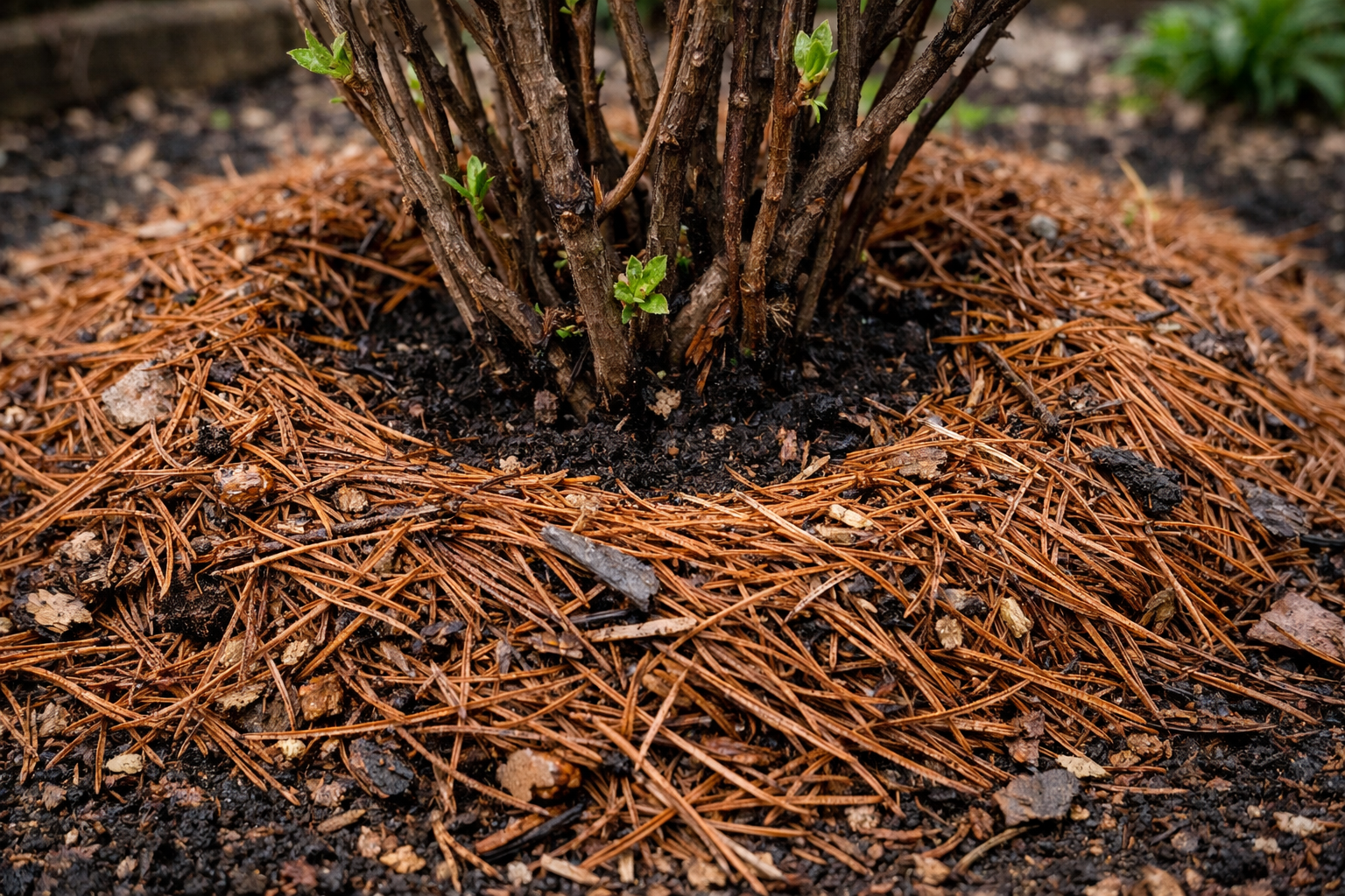 Amikor leesik a hó, a talaj különleges gondoskodást igényel. A csupasz talaj gyorsan veszít nedvességet és kérges lesz. Megfelelő mulcsozás megoldja ezt a problémát azáltal, hogy ideális mikroklímát teremt a gyökerek számára. Az erdei tűlevelek szivacsként viselkednek, esőben felszívják a vizet, száraz napokon pedig lassan leadják azt.