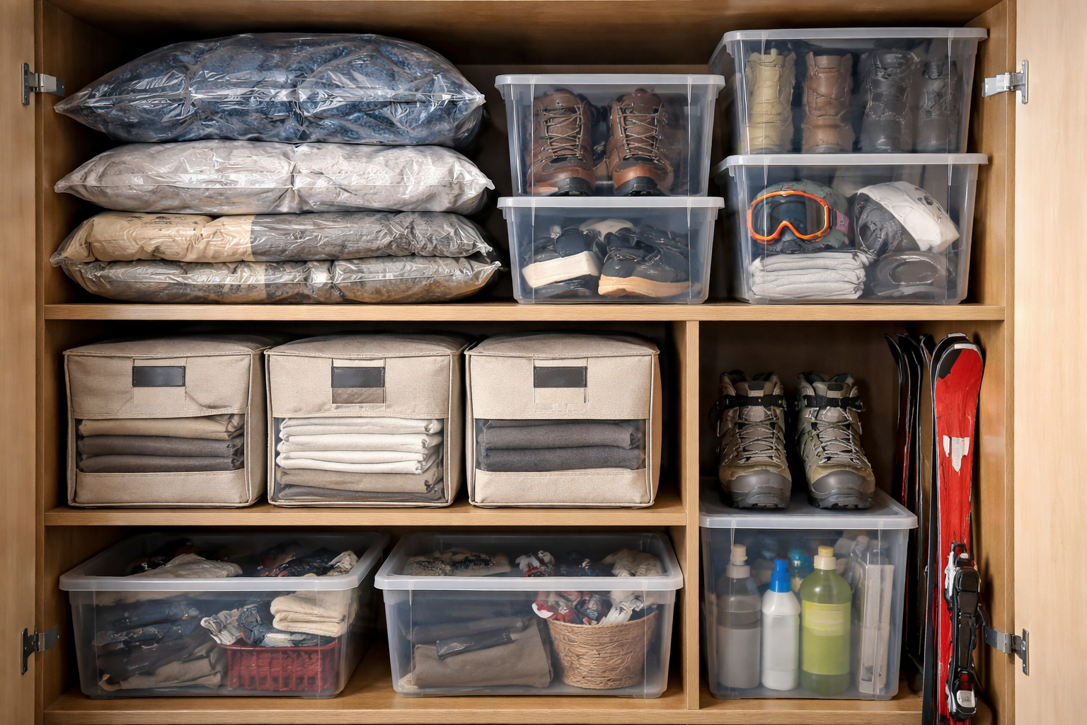 A nem szezonális árukészlet kitakarításakor az egyik legnagyobb hiba, hogy mindent egyetlen nagy dobozba próbálsz belezsúfolni. Mielőtt a dolgokat elrejtené, megfelelően rendszerezni kell őket. Vákuumzsákok и műanyag tartályok különböző feladatokat látnak el, és nem szabad őket összekeverni.