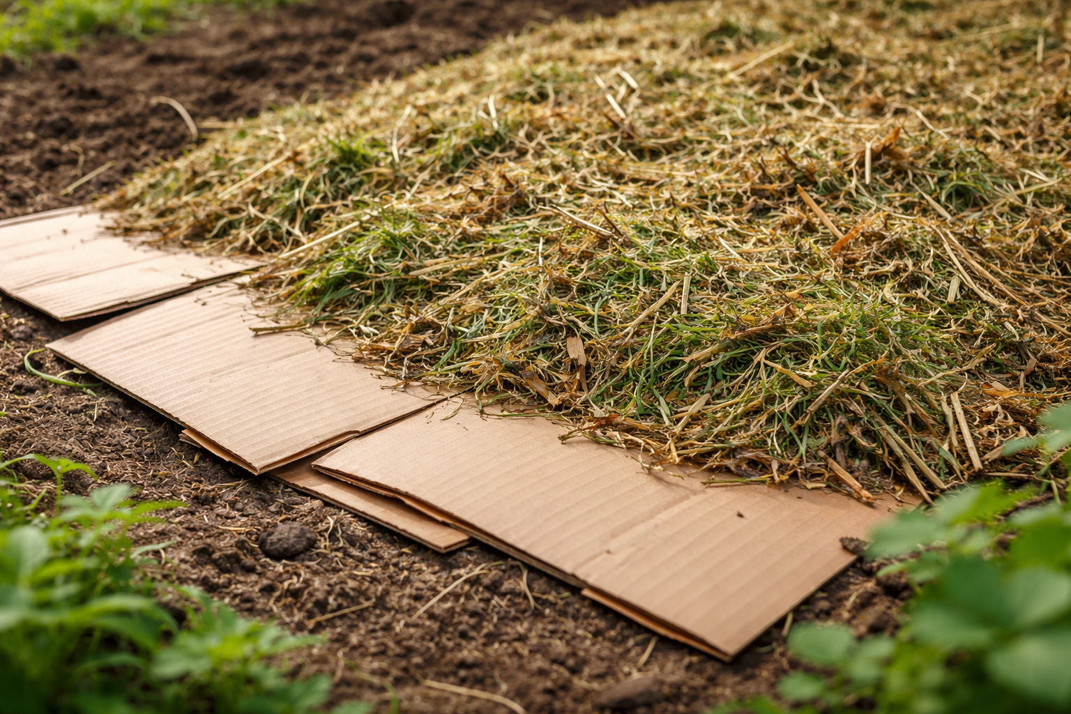 Fektesse le a gyomos területre szorosan, ragasztószalag nélkül a közönséges hullámkarton lapokat.