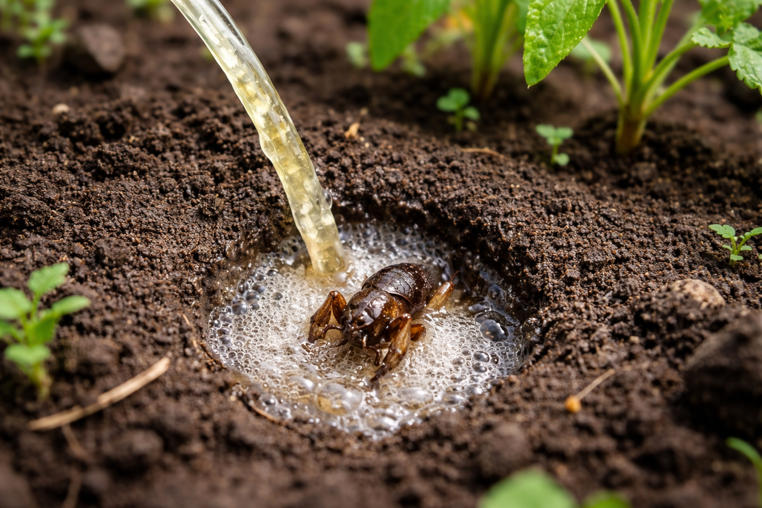 Öntse a folyadékot közvetlenül a kurzusba, amíg a kártevő meg nem jelenik a felszínen.