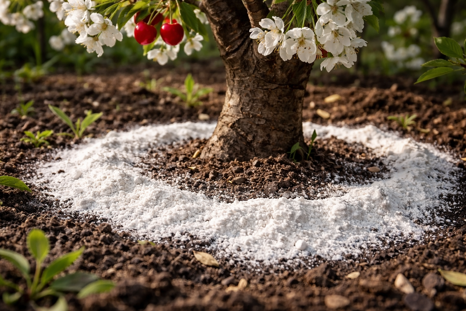 A cseresznyefák a gyökerek körüli talaj látens savasodása miatt gyakran elhullajtják a petefáikat, vagy apró, savanyú bogyókat termelnek. Ez a probléma könnyen megoldható a megfelelő természetes savtalanító tavaszi alkalmazásával, amely azonnal helyreállítja az egyensúlyt és alapvető ásványi anyagokkal táplálja a fát.