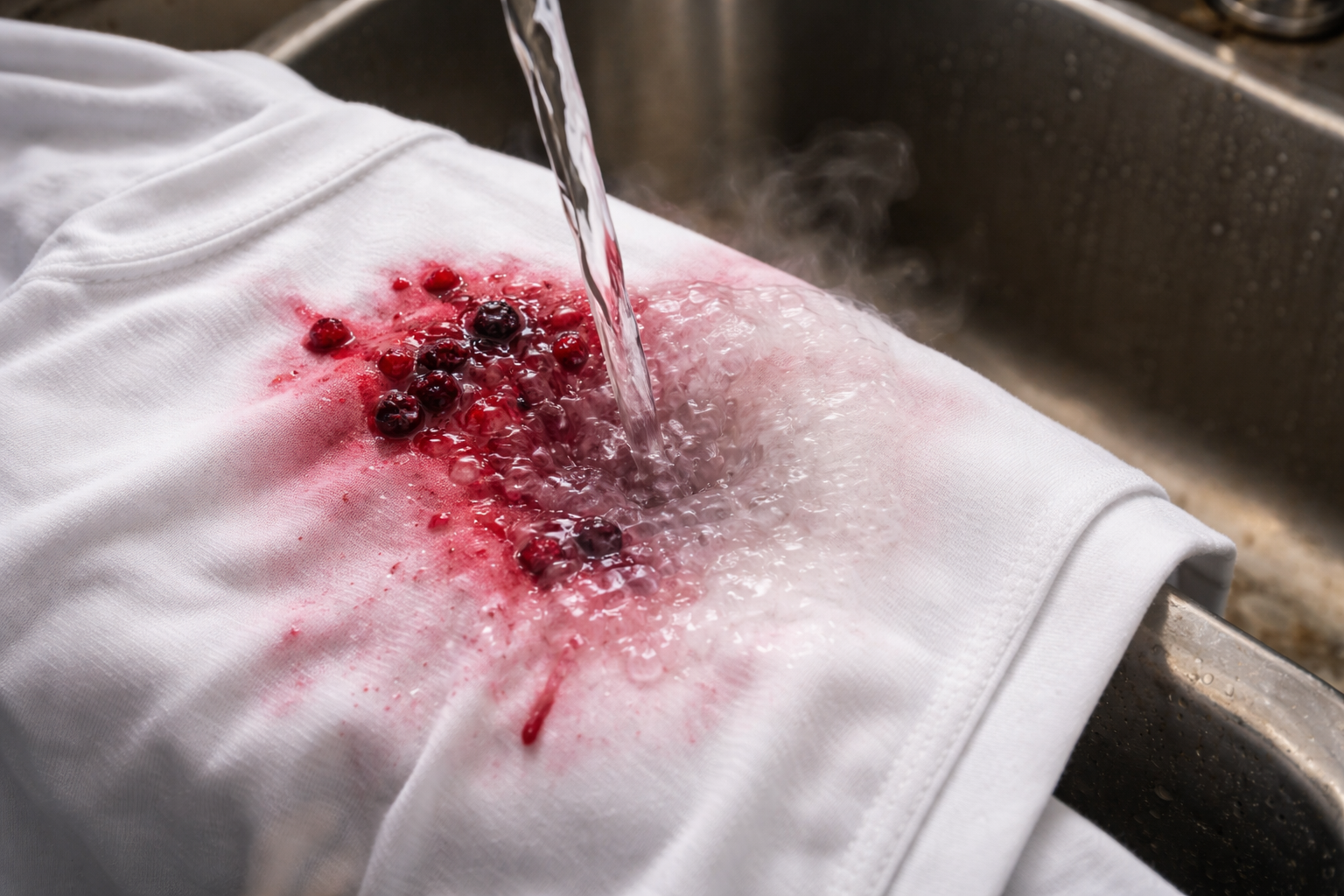 A friss szennyeződések elleni leghatékonyabb eszköz mindig kéznél van. Ez egy közönséges forró víz. A magas hőmérséklet azonnal lebontja a szerves színezékeket, így azok nem tudnak rögzülni a szálakban.
