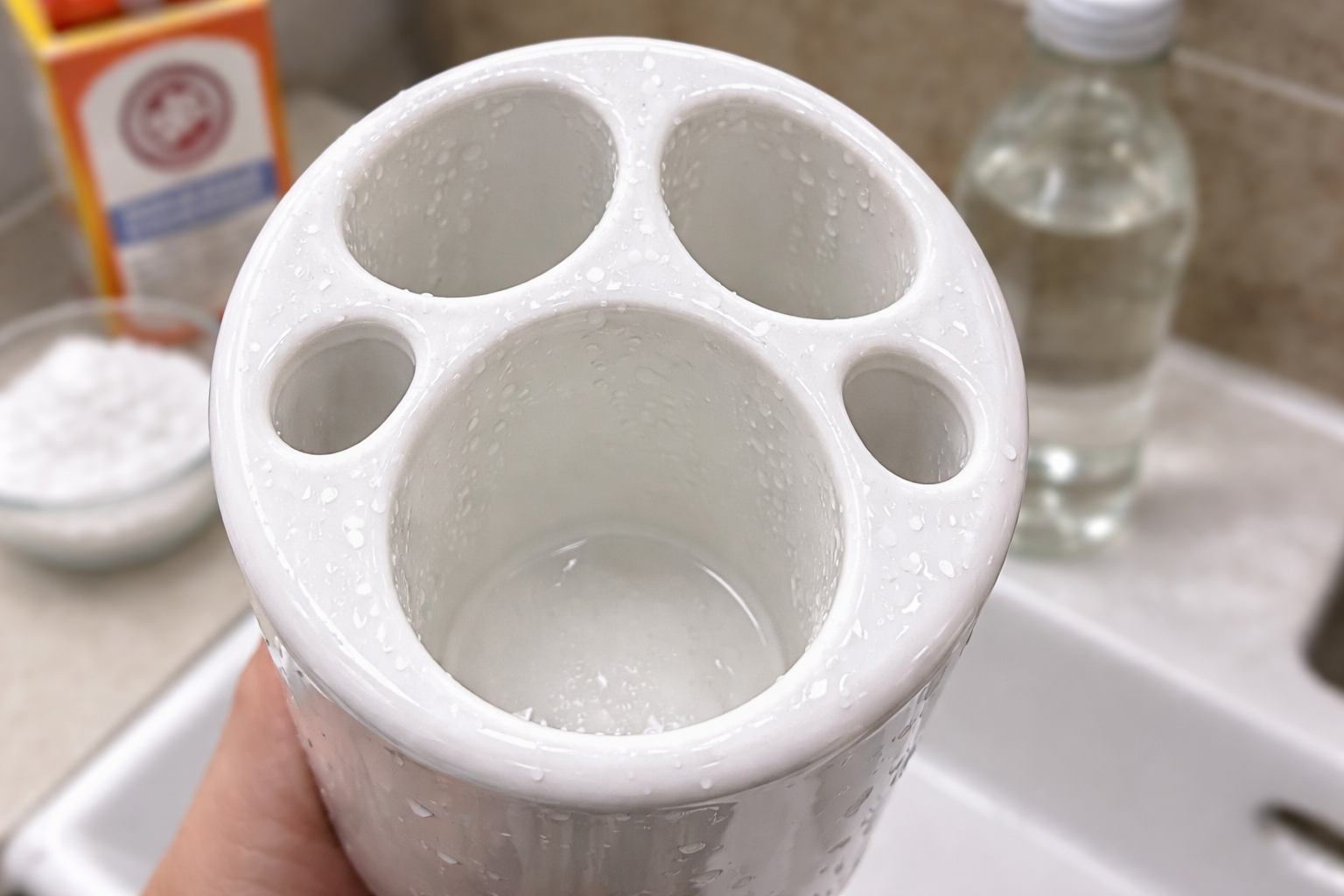 Gyakran figyelmen kívül hagyjuk ezt a tartozékot a takarítás során, pedig ez az, amelyik érintkezik a személyes higiéniai tárgyainkkal. Az alján vastag massza halmozódik fel, amit problémás lehet hétköznapi vízzel megtisztítani. Számos lehetőséget kipróbáltam, és megtaláltam a legjobb egyensúlyt a hatékonyság és a biztonság között.