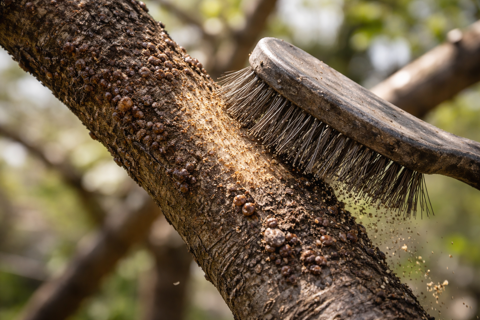 Az első dolog, amit mindig elvégzek, az az ellenőrzés és a mechanikai tisztítás. Ehhez egy közepesen kemény fémsörtéjű kefét vagy egy normál zsákkefét használok. Fontos, hogy a kinövéseket óvatosan, az élő kéreg sérülése nélkül keféljük le.